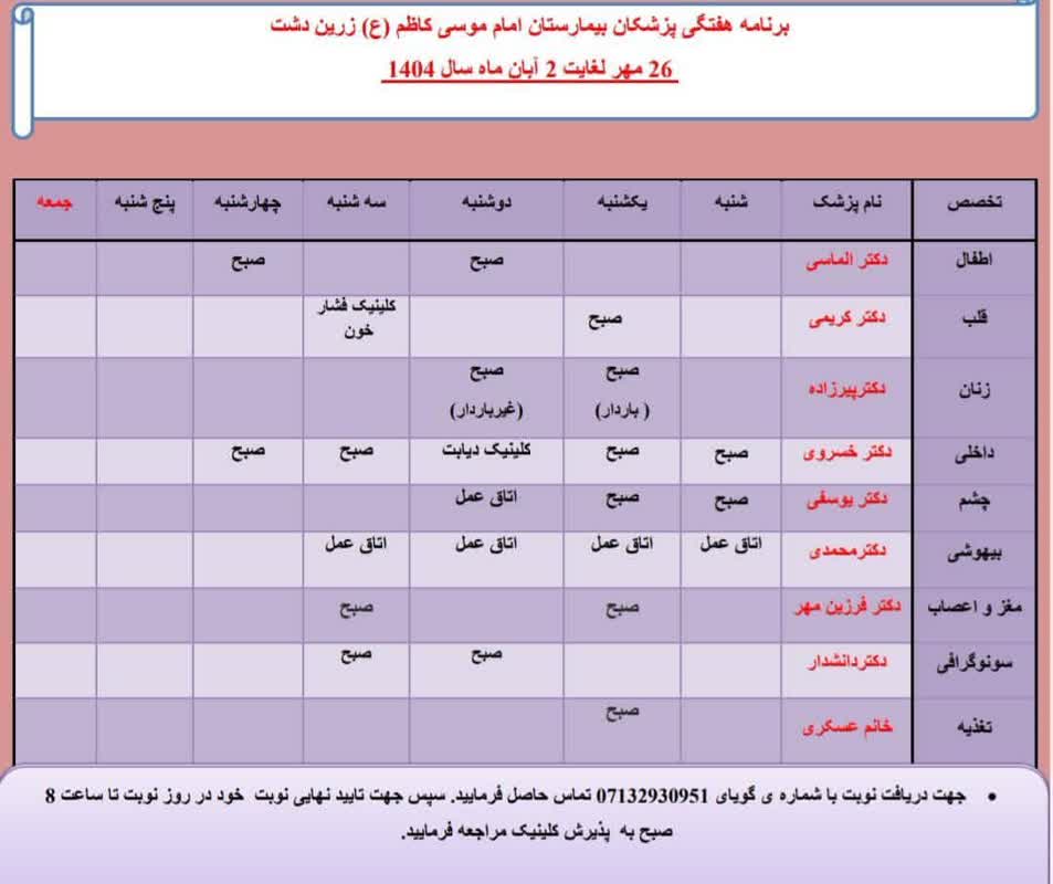 برنامه هفتگی پزشکان متخصص کلینیک تخصصی بیمارستان امام موسی کاظم (ع) شهرستان زرین دشت 26مهرتا 2 آبان ماه1404