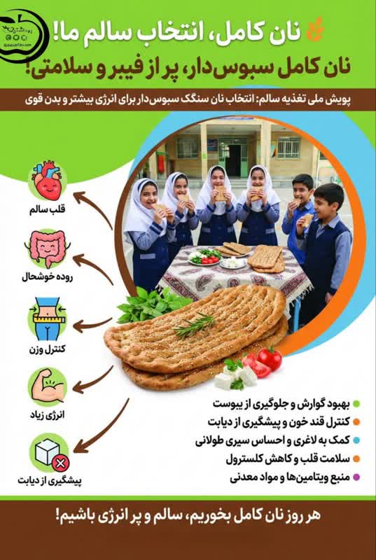 نان کامل نسبت به نان‌های تهیه‌شده با آرد سفید ارزش تغذیه‌ای بیشتری دارد. آرد کامل از تمام اجزای دانه گندم شامل آندوسپرم، سبوس و جوانه تهیه می‌شود و کمتر از ۶ درصد سبوس‌گیری دارد. وجود فیبر بالا در این نوع نان موجب بهبود عملکرد دستگاه گوارش، کاهش کلسترول LDL و کنترل قند خون می‌شود. اهمیت کاهش مصرف نمک در سبد غذایی روزانه مورد تأکید است.
