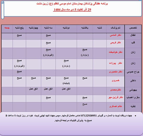 برنامه هفتگی پزشکان متخصص کلینیک تخصصی بیمارستان حضرت امام موسی کاظم (ع) زرین دشت