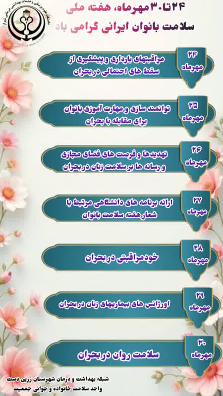 24 تا 30 مهر ماه هفته ملی سلامت بانوان ایرانی گرامی باد