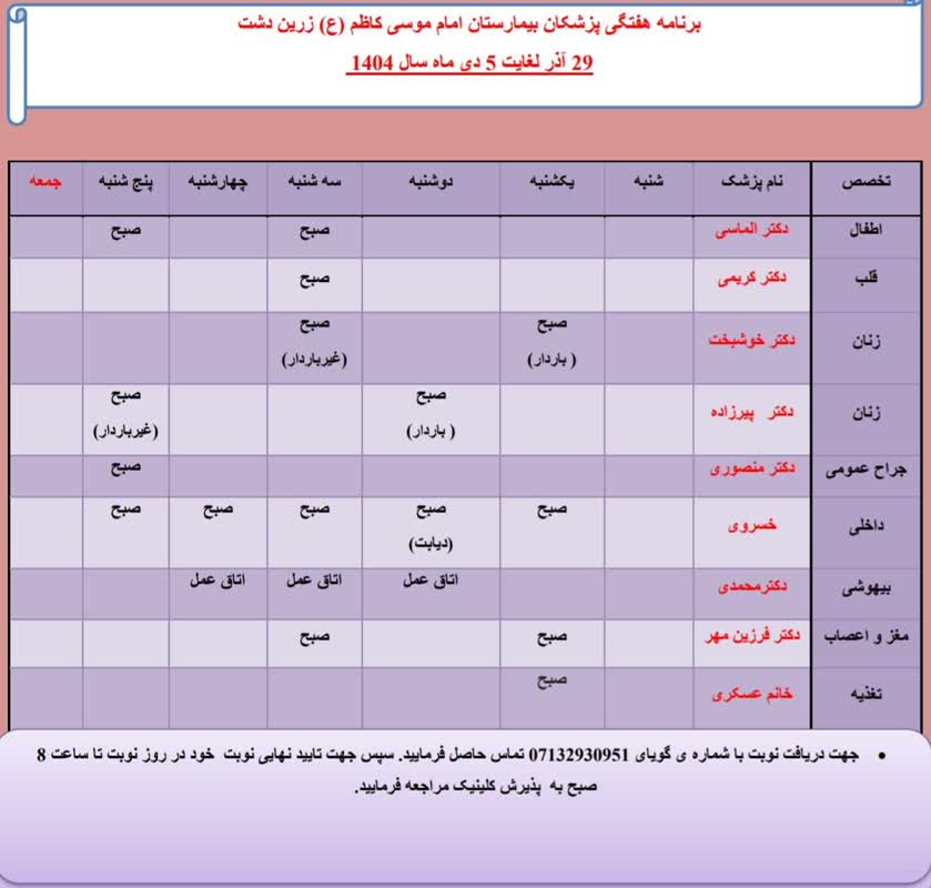 برنامه حضور متخصصان در کلینیک تخصصی بیمارستان امام موسی کاظم (ع) شهرستان زرین‌دشت 29آذر تا 5دی ماه 1404