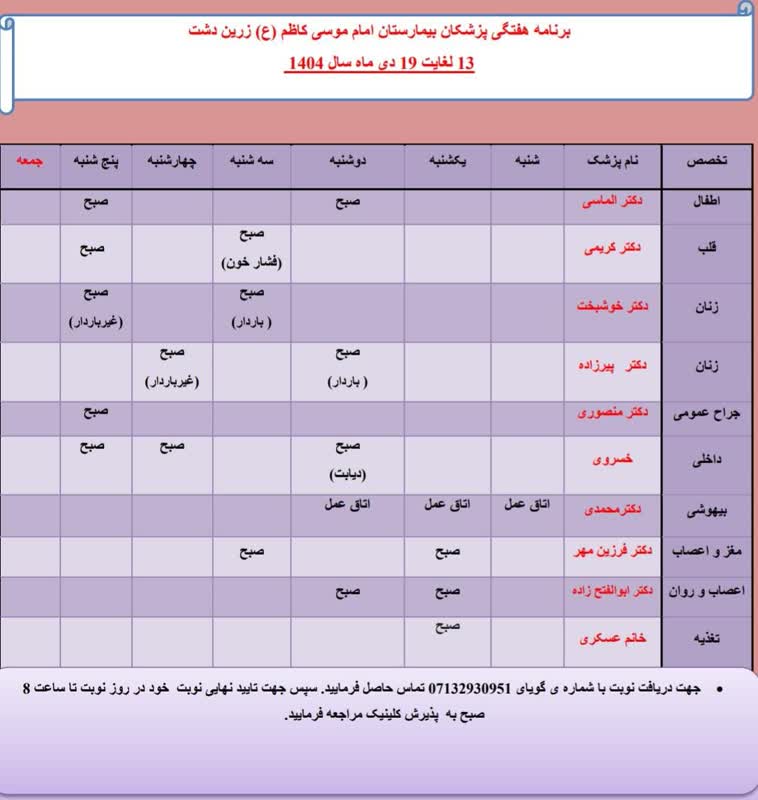 برنامه هفتگی پزشکان بیمارستان حضرت امام موسی کاظم (ع) زرین دشت